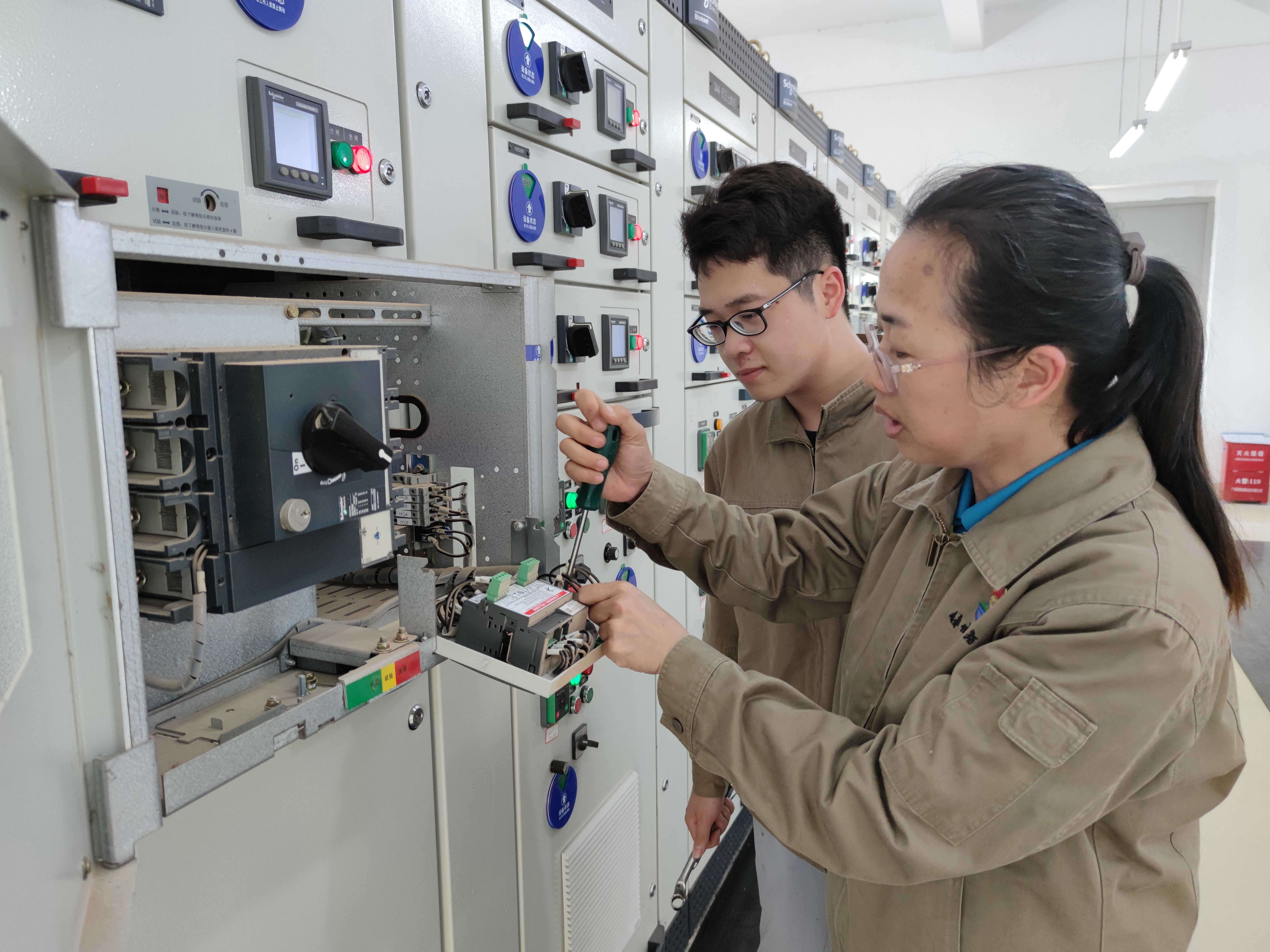 圖為江南污水處理廠黨員技術骨干覃映玫向新員工傳授低壓斷路器的維修技巧。韋嬋 攝