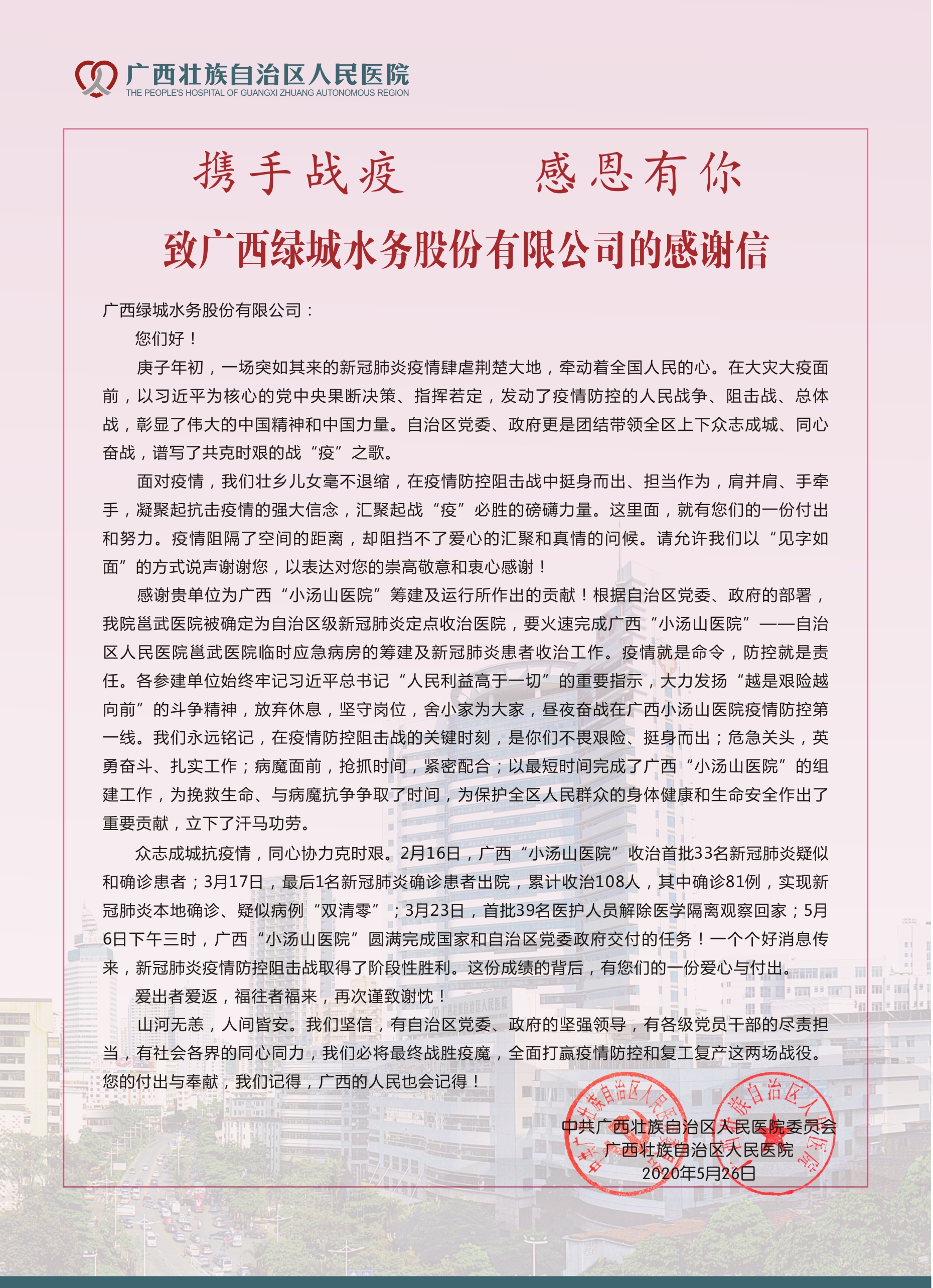 近日,南寧市企業和企業家聯合會舉辦“防控新冠肺炎疫情工作暨經驗交流會”,對在防控新冠肺炎疫情中做出貢獻的單位進行表彰,綠城水務榮獲“防控新冠疫情工作先進單位”榮譽稱號。